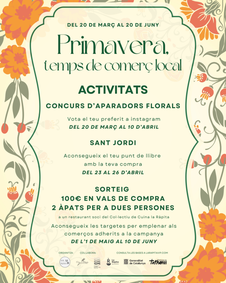 La Unió de Comerç Rapitenc (en endavant UCR) amb CIF: i domicili al C/ ha decidit dur a terme una campanya de Primavera del 20 de març al 20 de juny amb una promoció associada al sorteig de 100€ en vals de compra als comerços de la UCR i dos menús per a dues persones amb la col·laboració del Col·lectiu de Cuina la Ràpita-Delta de l’Ebre i l’Estació Nàutica de la Ràpita amb l’objectiu de dinamitzar les compres durant els mesos de març, abril, maig i juny.